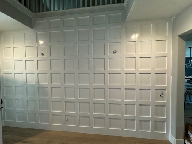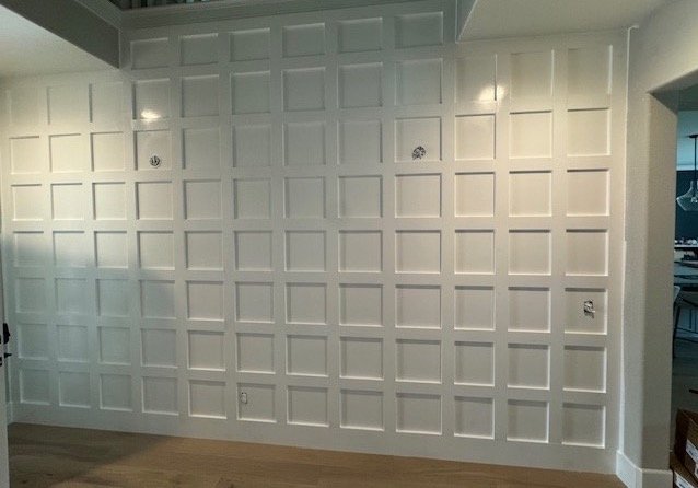 The wall features classic white wainscoting with clean, square panel detailing that adds depth and elegance to the space. The crisp white paint enhances the room’s brightness while giving the wall a timeless appearance to the interior.