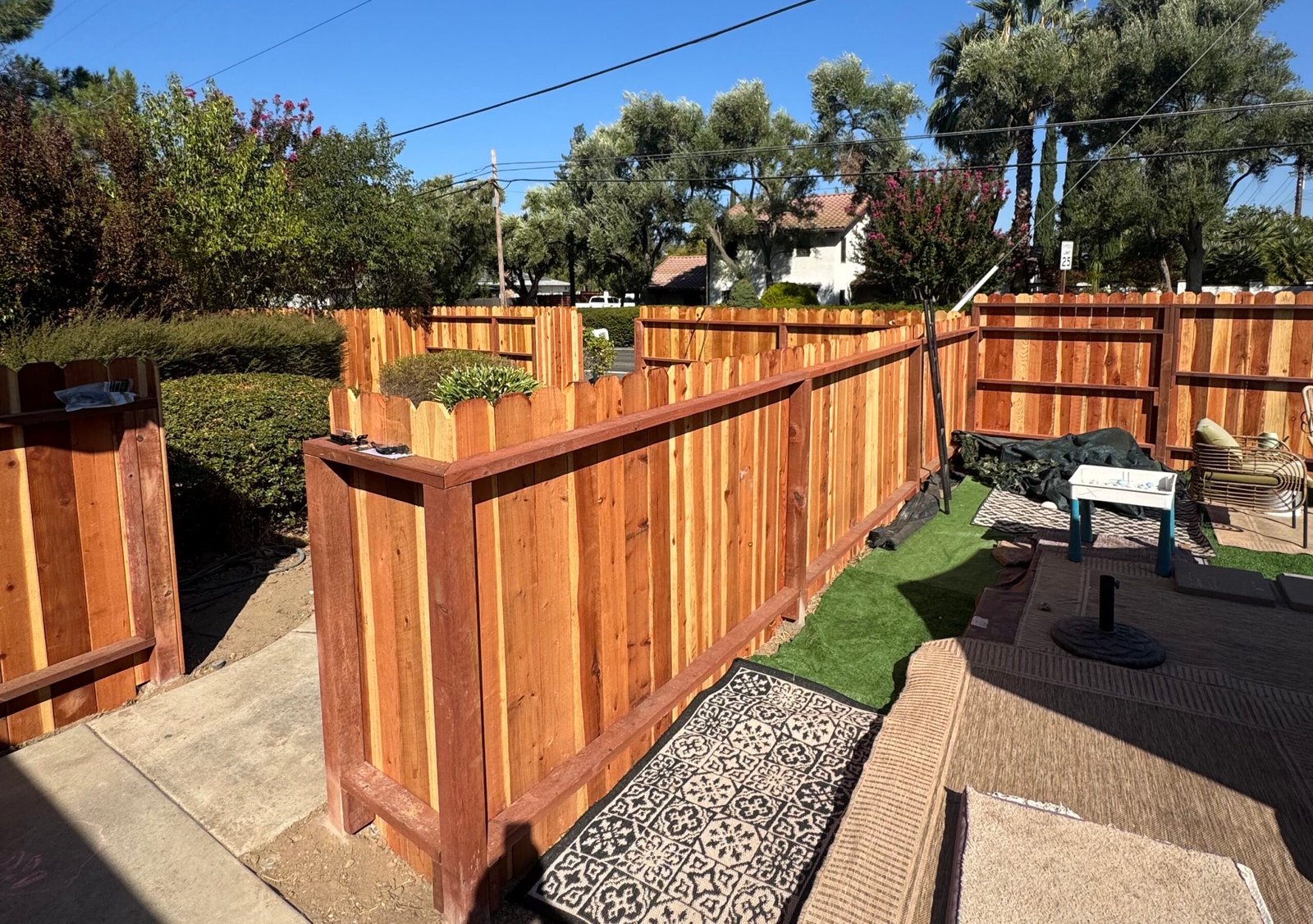 This fence was expertly installed around the backyard, providing privacy and a warm, natural look that complements the home. Set within a quiet residential area, the fence clearly defines the property while enhancing security and aesthetics.